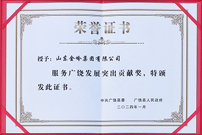 2024年1月19日,在廣饒縣委、縣政府召開的全縣新型工業(yè)化推進(jìn)大會(huì)上,山東金嶺集團(tuán)有限公司被授予“服務(wù)廣饒發(fā)展突出貢獻(xiàn)獎(jiǎng)”榮譽(yù)稱號(hào),以表彰公司對(duì)地方經(jīng)濟(jì)發(fā)展做出的突出貢獻(xiàn)。