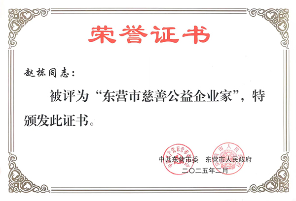 2025年2月10日,東營市優(yōu)秀企業(yè)和企業(yè)家表彰大會召開,集團公司被評為“2024年度東營市納稅突出貢獻企業(yè)”,總裁趙棟被授予“東營市優(yōu)秀青年企業(yè)家”“東營市慈善公益突出貢獻企業(yè)家”榮譽稱號。