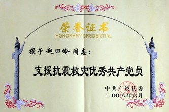 董事長趙曰嶺被授予“支援抗震救災(zāi)優(yōu)秀共產(chǎn)黨員”稱號